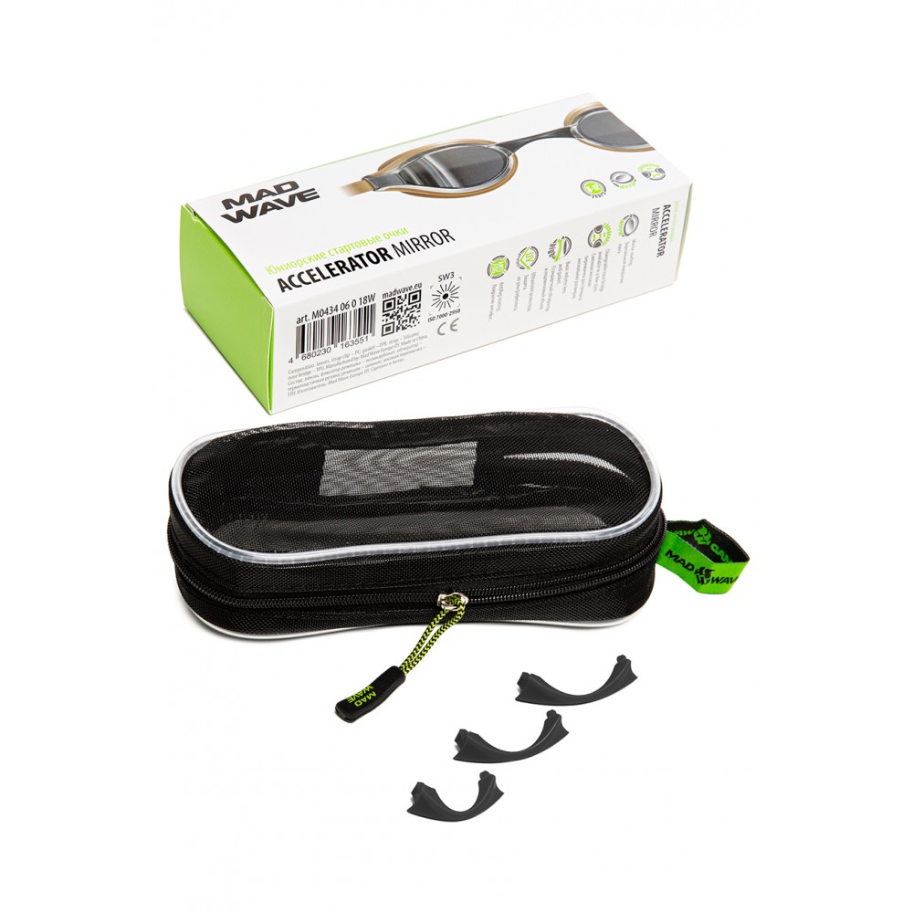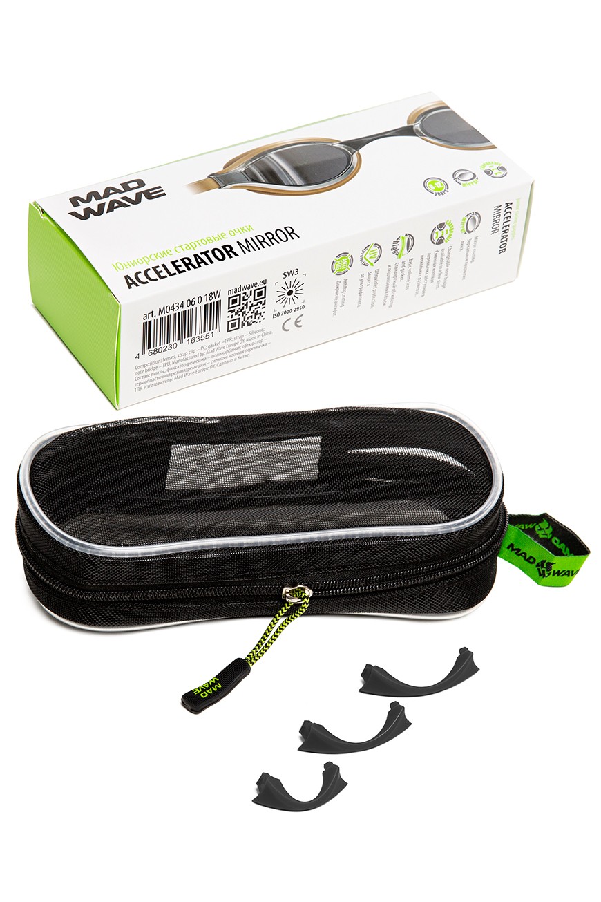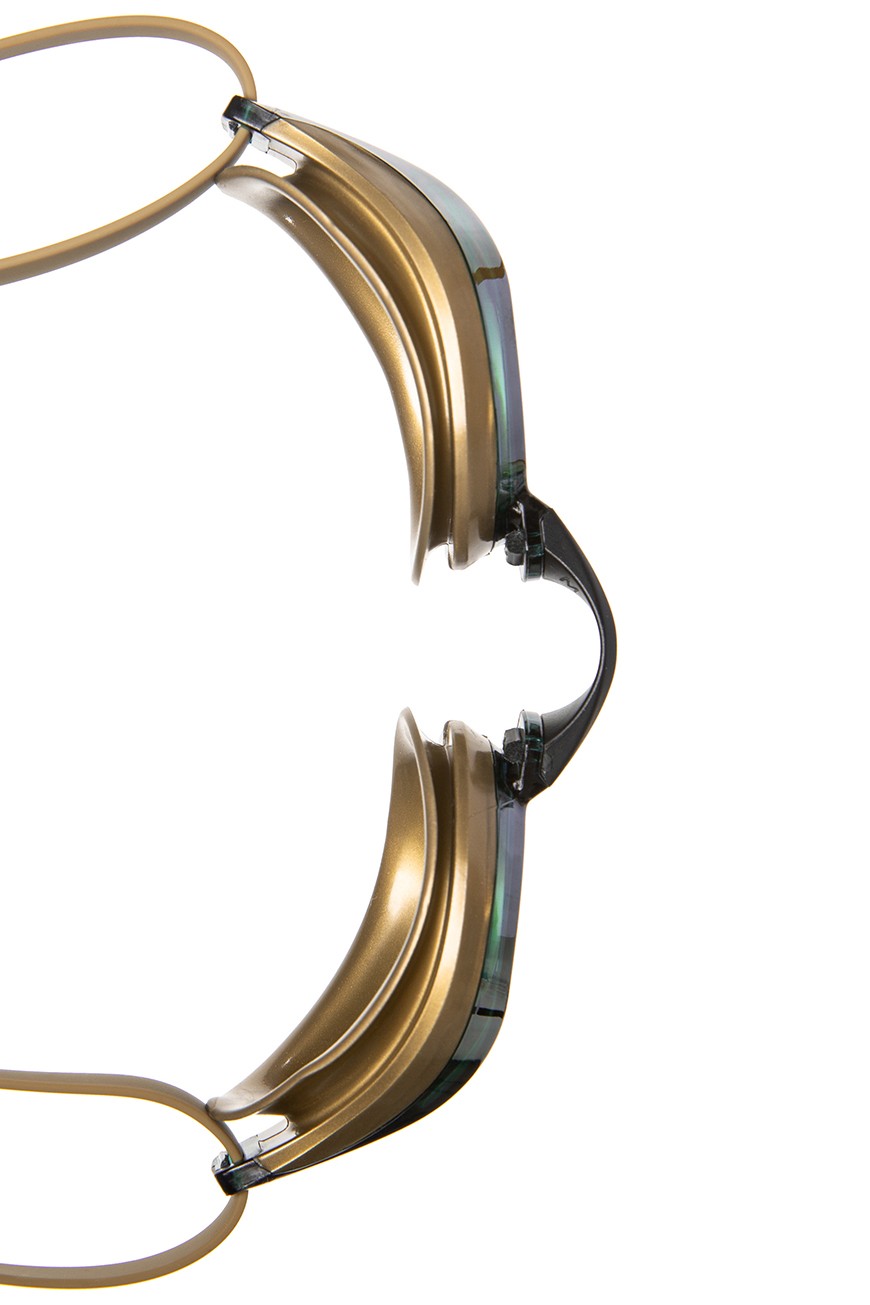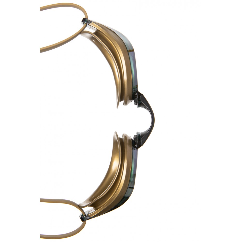 The mirror lenses block bright light and glare on the water. They are ideal for competition in brightly lit pools as well as long training sessions in the pool or open water. The goggle's streamlined shape and low profile seal reduce resistance to oncoming water flow for maximum speed. The rounded lenses create enhanced front and side vision for better control of your opponents. The goggles fit snugly and securely over the eye sockets and have a rigid fit to ensure the goggles do not come off during a sharp start or turn. The goggles come with three interchangeable nose bridges. They allow you to adjust the glasses more precisely to your individual facial features. The double silicone strap is easy to adjust with a special clip and keeps the glasses securely on your head. Polycarbonate mirrored lenses with UV protection protect the swimmer's eyes from harmful UV rays. Anti-fog coating prevents moisture from condensing on the lenses.
