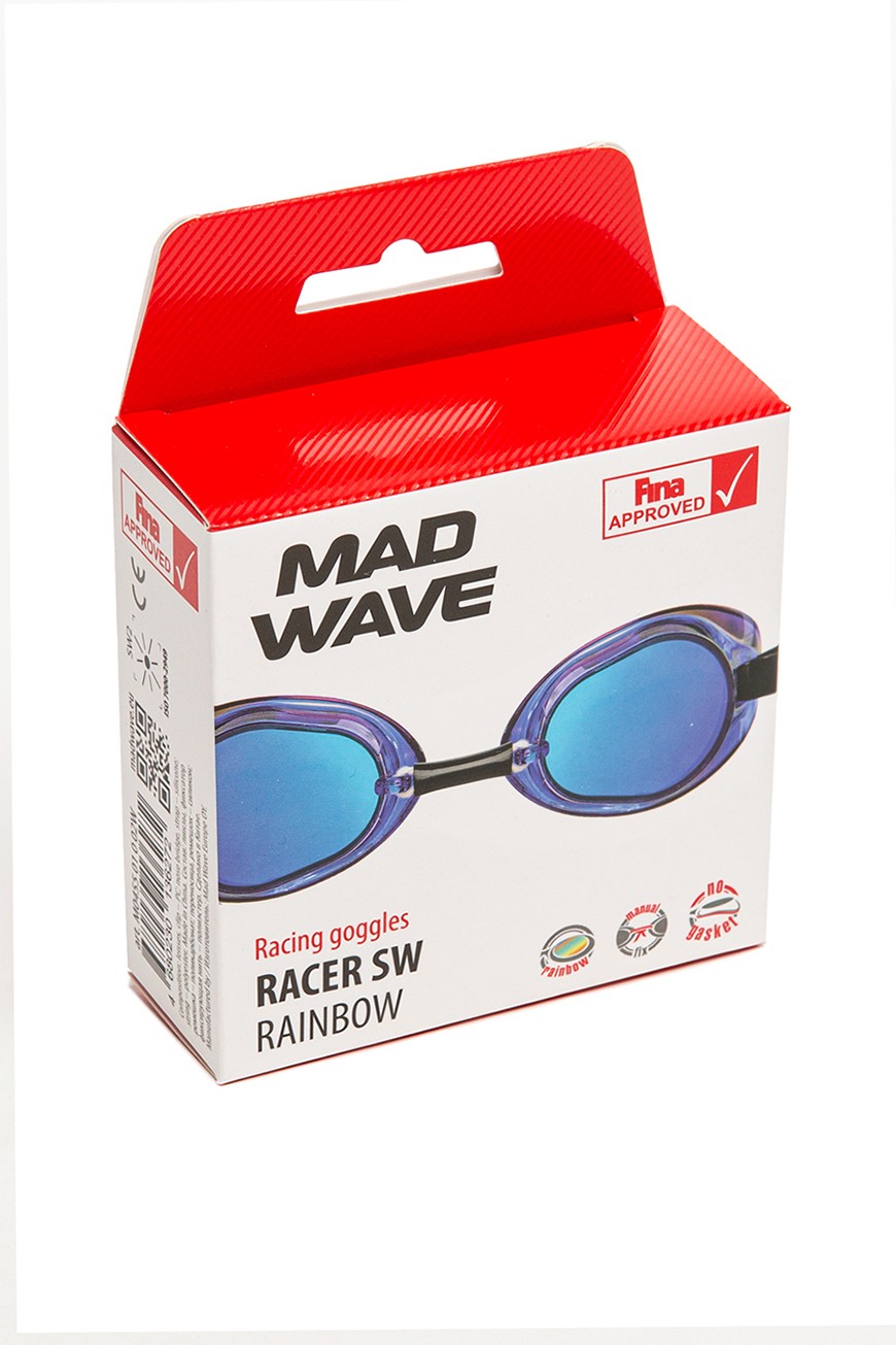 Mad Wave's Racer SW rainbow racing goggles are a perfect choice for serious performance.Traditionally these goggles have a low profile and hard frame construction to reduce drag in the water and help you swim faster. The self-assembled nose bridge and double silicone strap deliver an ideal and secure fit. Rainbow polycarbonate mirror lenses with UV protection shield the swimmer's eyes from harmful ultraviolet radiation. The Anti-fog coating prevents moisture condensation on the lenses. The goggles is sold unassembled. This allows you to adjust the length of the nose bridge and the position of the lenses to fit your individual facial parameters. The goggles are certified by the World Aquatics Federation for participation in international competitions.